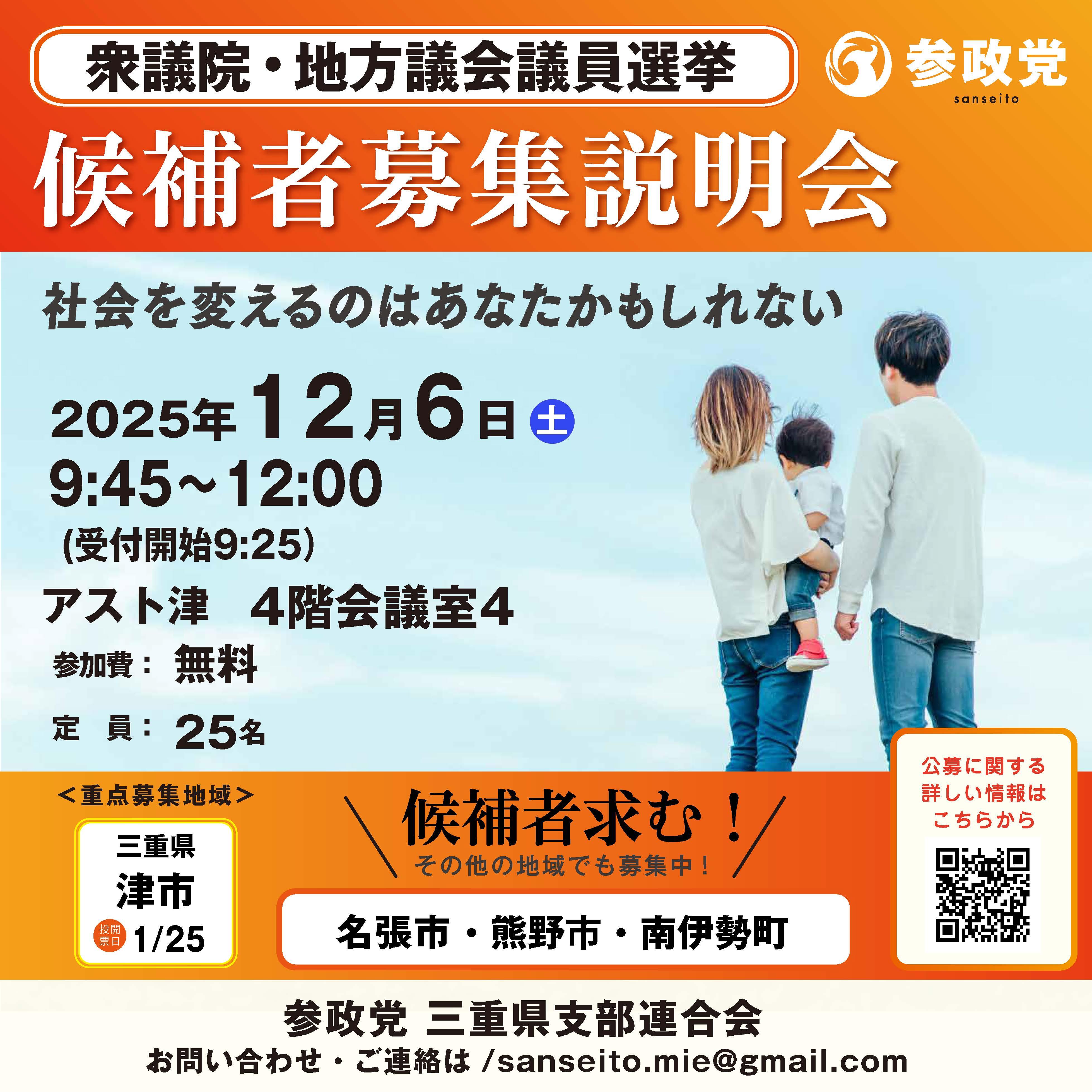 12/6(土) 衆議院・地方議会議員候補者募集説明会 (三重県津市) 三重県支部連合会
