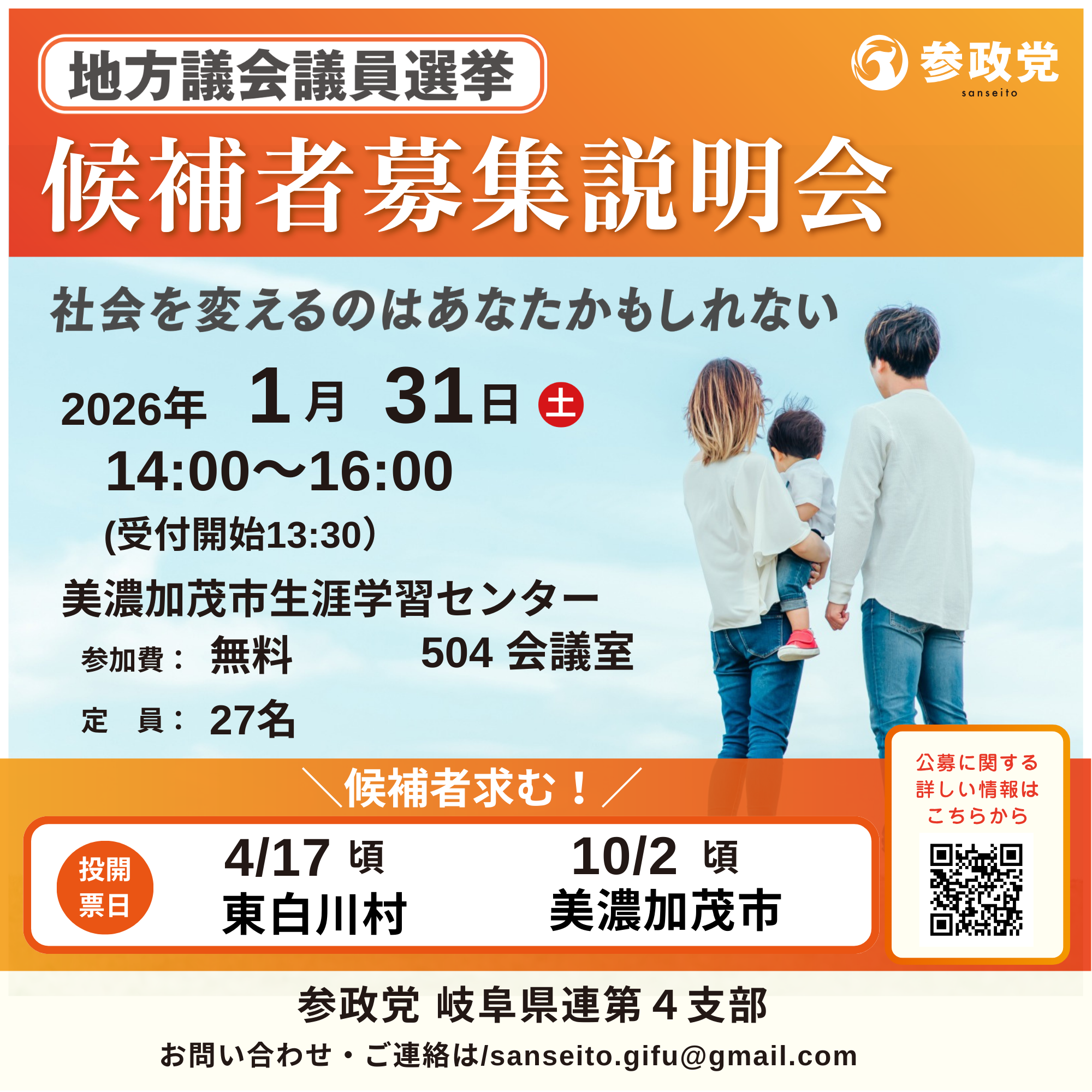 ※日程変更 1/31(土) 地方議会議員選挙候補者募集説明会 (岐阜県美濃加茂市) 岐阜第4支部